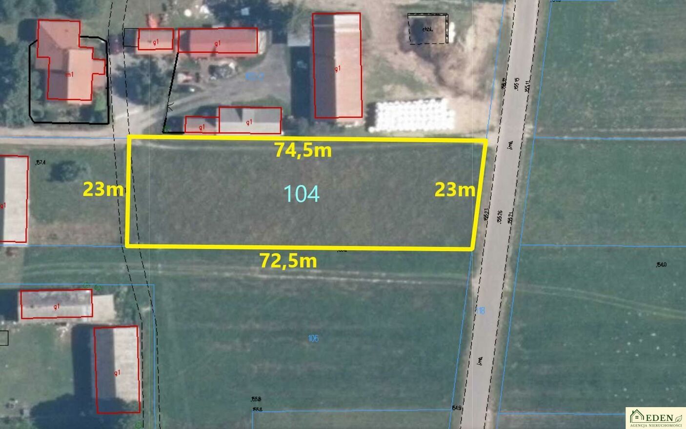Działka nr 104 ma prostokątny kształt, o wymiarach około 23 m x 73 m, co daje duże możliwości zagospodarowania terenu.
